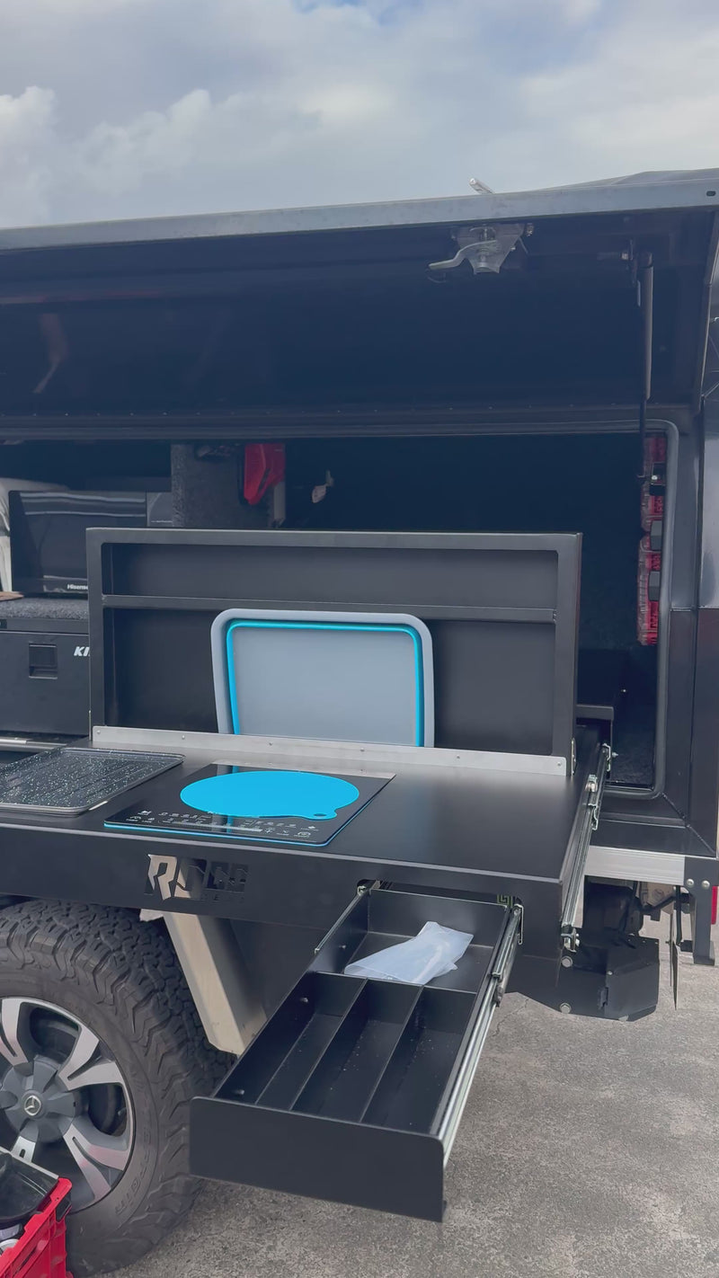 Packed with features, it includes a flush soft-close cutlery drawer, KickAss 2000W induction cooktop, KickAss 600W BBQ, and a KickAss lithium shower/tap for added versatility at camp. The standout feature is our patented lift-up / fold-down locking pantry design, giving you fast access, secure storage, and a practical workspace all in one.